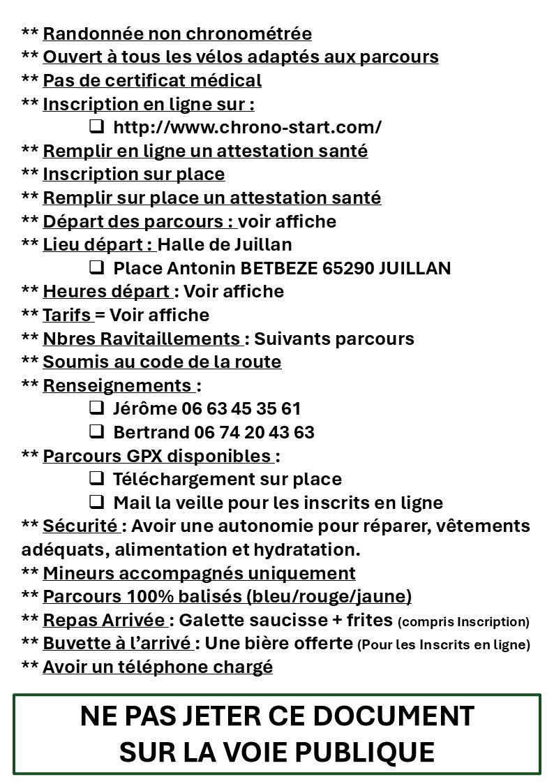 CRAPA’UTTADE 2018…………Le DIMANCHE 03 JUIN 2018 (9h) NOUVEAUTE = Cette année c’est certificats médicaux OBLIGATOIRE pour les non licenciés VTT et Cyclisme… Idem pour les marcheurs Challenge Nouvelle République N°3 de l’ADVTT65, penser à venir avec vos cartes ADVTT du challenge. **Parcours Marche de 10 et 16kms avec un ravitaillement pour les deux parcours (Inscription 6€) […]